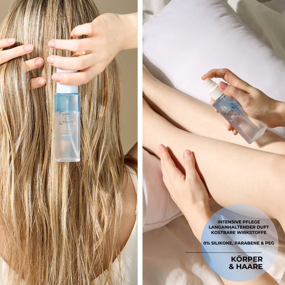 INTENSIV PFLEGENDE DUAL-TEXTUR FÜR KÖRPER & HAAR | ERSETZT DIE BODY LOTION & WIRKT ALS LEAVE-IN-TREATMENT FÜR DAS HAAR | SPENDET FEUCHTIGKEIT, PFLEGT OHNE ZU BESCHWEREN & WIRKT ANTISTATISCH | ERFRISCHT, BEDUFTET & NEUTRALISIERT UNANGENEHME GERÜCHE | 100% NATÜRLICHER, LANGANHALTENDER DUFT | OHNE AEROSOLE – IDEAL FÜR REISEN