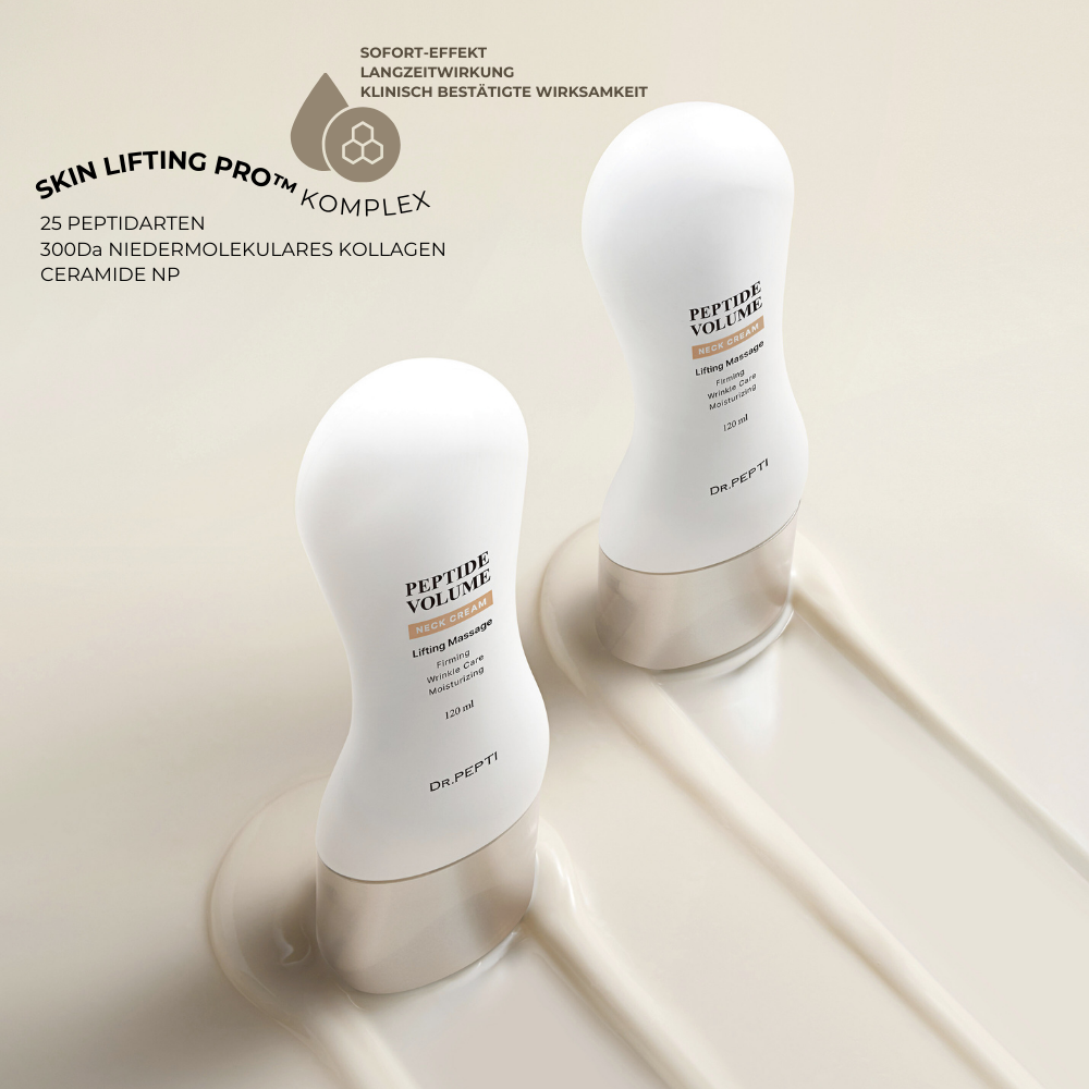 Die Peptide Volume Neck Cream ist eine hochkonzentrierte, professionelle Lifting-Pflege für Hals, Nacken und Dekolleté – jene Hautpartien, die besonders früh zu Elastizitätsverlust, Faltenbildung und erschlafften Konturen neigen. Im Zentrum steht SKIN LIFTING PRO™, ein patentierter Wirkstoffkomplex mit mehrfach klinisch belegter Lifting-Wirkung, der die Haut sichtbar strafft und die Halskonturen glättet – bereits nach einer Anwendung. Der Wirkstoffkomplex kombiniert 25 Peptidarten, niedermolekulares Kollagen, feuchtigkeitsbindende Wirkstoffe, regenerierende Lipide und strukturstärkende Proteine. Die reichhaltige, dennoch nicht klebende Textur verschmilzt mit der Haut und sorgt für ein sichtbar glatteres, strafferes und jugendlich gepflegtes Hautbild im Hals- und Nackenbereich.