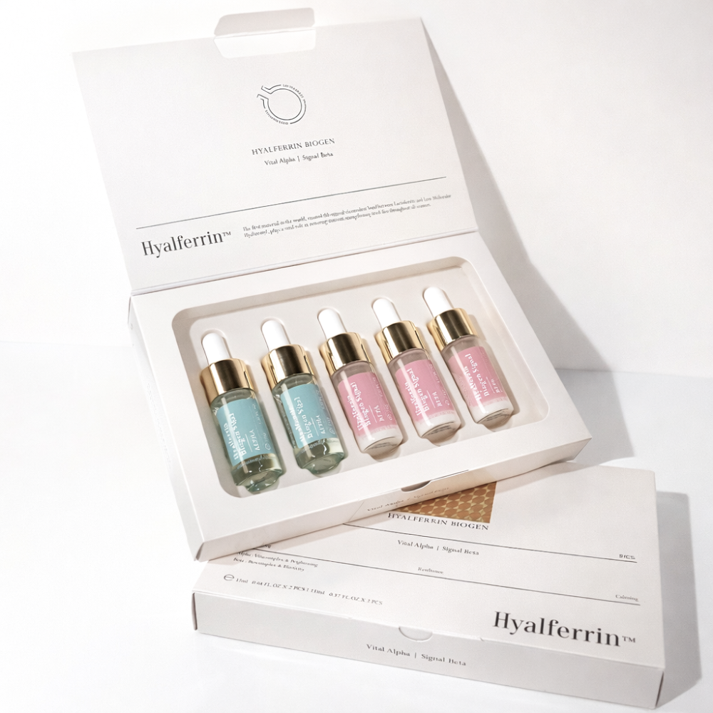 HYALFERRIN™ BIOGEN SIGNAL AMPOULE SET Concentrato in ampoule bifasico ad alta efficacia con Lactoferrin, bFGF, VEGF & Tranexamoyl Tetrapeptide-51 (rigenerazione profonda, maggiore compattezza & riduzione delle rughe sulla pelle matura)